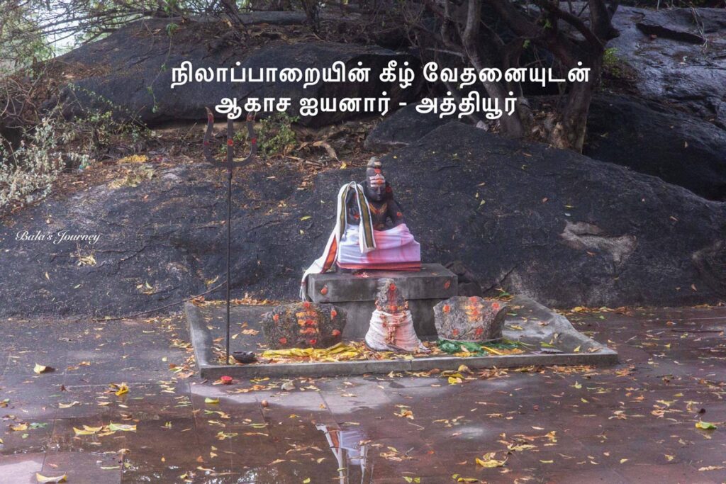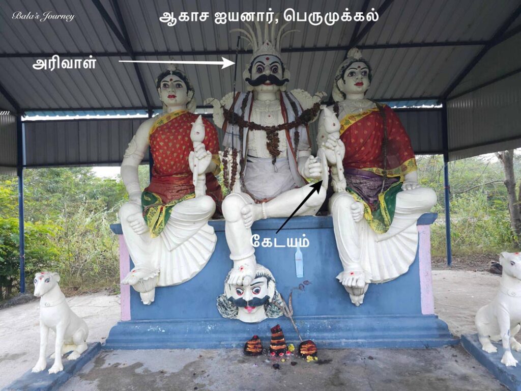 மிகவும் வித்தியாசமாக இங்குள்ள ஐயனாரின் ஒரு கையில் அரிவாளும் மற்றொரு கையில் போரின் போது பயன்படுத்தும் கேடயமும் உள்ளன. இதை வைத்துத்தான் முக்கல் ஆசான் நல்வெள்ளையாரும் பூதப்பாண்டியனின் படையில் தளபதியாக இருந்த அவருடைய நண்பர் கணி நந்தாசிரிய இயக்கனும் ஒருவரே என்கிறார் க.நெடுஞ்செழியன் அவர்கள். வாய்ப்பு இருக்கிறது. ஆனால், இந்த சான்று ஒன்று மட்டும் போதுமா என்று தெரியவில்லை. இந்த ஐயனாரின் இருபுறமும் பூரணை, புஷ்கலை பெண்தெய்வங்கள். நான் முன்பு ஒருமுறை எழுதியதுபோல இங்குள்ள மக்களில் ஓரிருவர் தவிர வேறு யாருக்கும் இவரின் “ ஆகாச ஐயனார்” என்ற முழுப்பெயர் தெரியவில்லை. பொதுவாக “ஐயனாரப்பன்” என்றே அழைக்கின்றனர்.