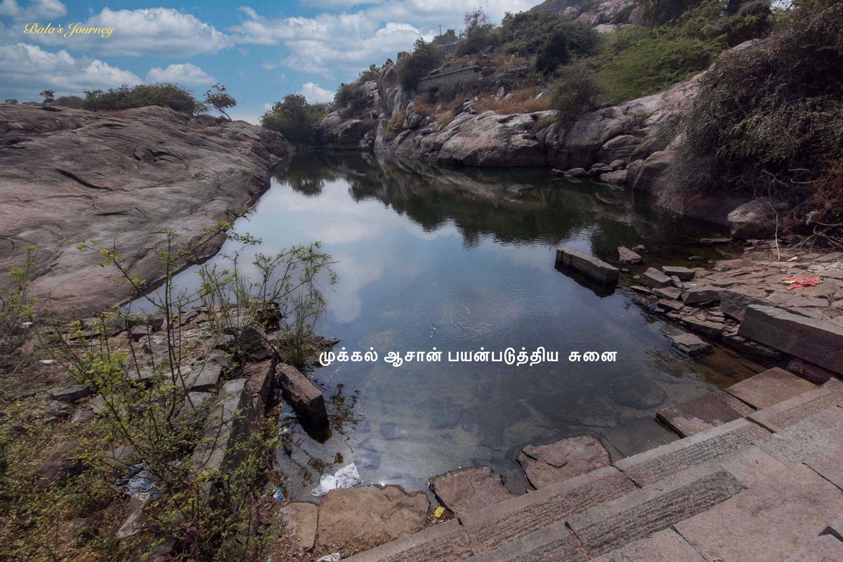 மலையின் முக்கால் வாசி உயரத்தில் ஒரு அருமையான சுனை இருக்கிறது – ரொம்பப் பெரிய சைஸில்.  நமது தமிழ் அறிவர்கள் , பெரும்பாலும் தங்கள் தண்ணீர்த் தேவைகளுக்காக ஒரு நல்ல சுனை இருக்கும் இடத்திற்கு அருகில் உள்ள குகைகளிலேயே தங்கள் வாழ்விடத்தை அமைத்து வானியல் ஆய்வும், மருத்துவ உதவிகளும், கல்விச் சேவைகளும் செய்து வந்துள்ளனர். அதற்கு பெருமுக்கலும் ஒரு நல்ல உதாரணம். முக்கல் ஆசான் கை நனைத்த சுனையில் நானும் கை கழுவி, முகம் கழுவி, சிறிது நீர் பருகி விட்டு என் பயணத்தைத் தொடர்ந்தேன்.